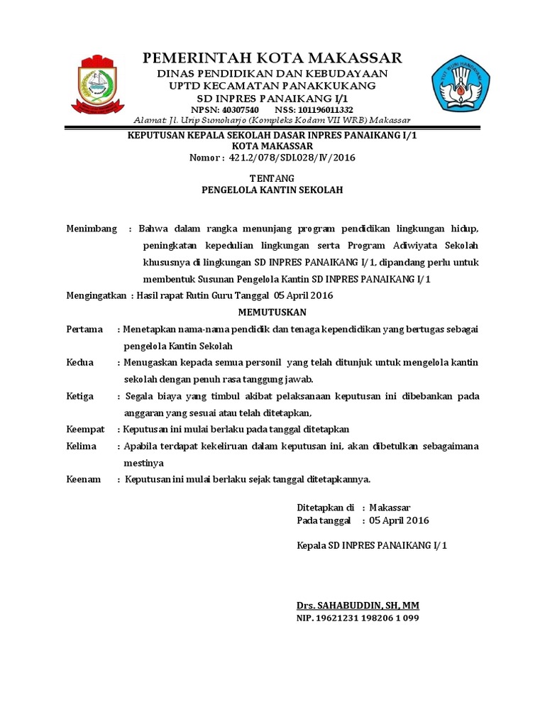 Keberadaan kantin disekolah adalah sesuatu yang sangat dibutuhkan terutama oleh siswa.bayak diantara siswa yang tidak sempat makan dirumah tempat kantin itu berada dimana ? Berikut ini kami sampaikan rujukan surat keputusan yayasan perihal pemberhentian kepala sekolah/madarasah. Contoh sk pengangkatan kepala sekolah paud. Pemerintah kota banjarmasin dinas pendidikan sekolah dasar negeri sungai jingah 6 kecamatan banjarmasin utara alamat : Bahwa agar butir 1, 2 dan 3 dapat terlaksana dengan optimal, dipandang perlu ditetapkan surat keputusan kepala sekolah tentang kalender pendidikan sd negeri. Berikut kami akan bagikan contoh format sk penetapan struktur organisasi sekolah. Pemerintah kabupaten kotawaringin barat dinas pendidikan pengelola a. Segala biaya yang di timbulkan akibat pelaksanaan ini di bebankan pada anggaran sekolah. Komite harus mendokumentasikan keputusan mereka yang akan ditampilkan di papan pengumuman. Mendeskripsikan keadaan dan bentuk kantin disekolah untuk mengetahui desain. Berikut contoh sk (suratkeputusan) pengangkatan operator sekolah yang bisa menjadi contoh. Demikian contoh sk penunjukan petugas pengelola beasiswa pip semoga bermanfaat. Contoh sk kepala sekolah tentang kaldik.