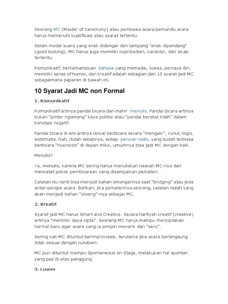(bahasa bisa tdk baku, improvisasi bebas, gerakan dinamis, naskah bisa berupa pointers). Bagaimana kabarnya masyarakat banyuwangi,, kami sapa dulu assalamualaikum wr wb. Berikut susunan acara dan naskah mc formal, sangat cocok untuk anda yang pemulan ada. Tausiyah yang akan dibawakan oleh . Acara non formal = mc non formal. Bisa jadi referensi buat temen2 yg pengen tahu dunia mc. Bahkan tidak sedikit orang yang mencari contoh teks mc non formal. Selamat malam dan salam sejahtera bagi kita semua. Halo semua, apa kabarnya nih? Sambutan dari nafisya yang berulang tahun · 3. Contoh teks mc non formal ulang tahun · 1. Adapun artikel contoh teks mc kali ini adalah naskah mc yang secara khusus untuk jenis acara . Untuk acara formal maupun acara non formal.